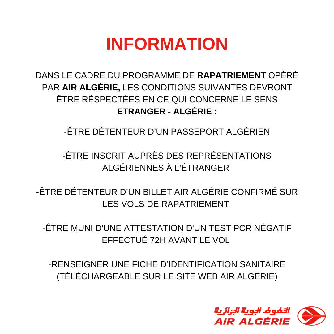 بالإضافة الى أن يحوز على تذكرة سفر من الجوية الجزائرية مؤكدة لرحلات الإجلاء.