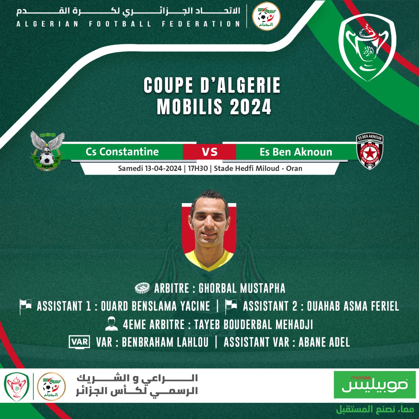 فيما سيدير مباراة شباب قسنطينة ونجم بن عكنون الحكم غربال مصطفى، والتي ستجري بملعب ميلود هدفي بوهران يوم السبت 12 أفريل من نفس الشهر.