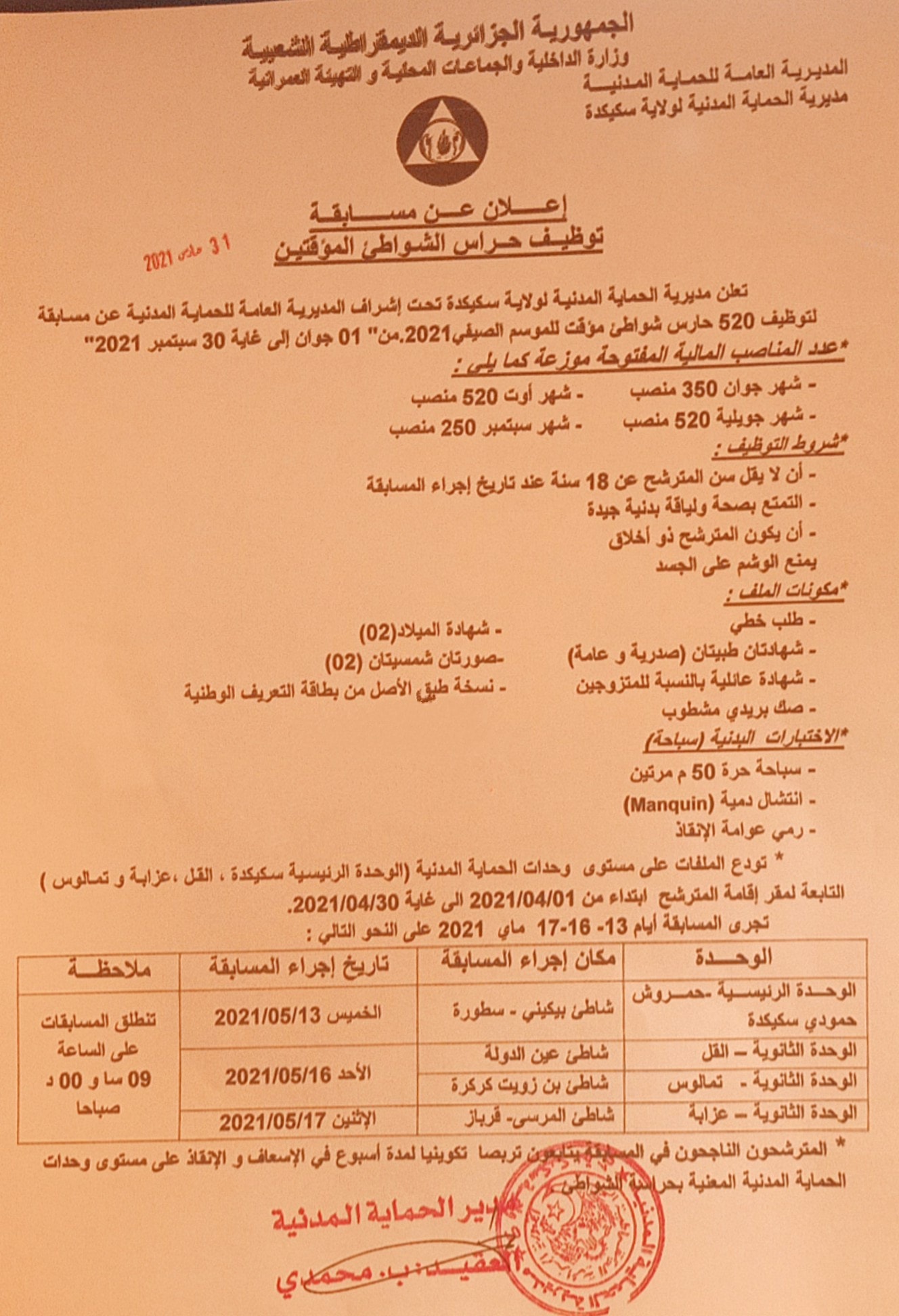 أعلنت مديرية الحماية المدنية لولاية سكيكدة، عن فتح مسابقة لتوظيف 520 حارس شواطئ مؤقت للموسم الصيفي 2021.