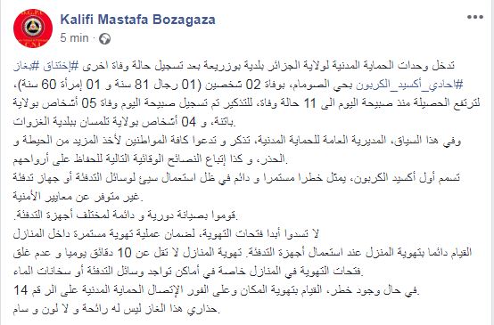 واخر ضحايا الغاز سجلت ببلدية بوزريعة حيث توفى تخصين بحي الصومام، للتذكير تم تسجيل صبيحة اليوم وفاة 5 أشخاص بولاية باتنة، و04 أشخاص بولاية تلمسان ببلدية الغزوات.