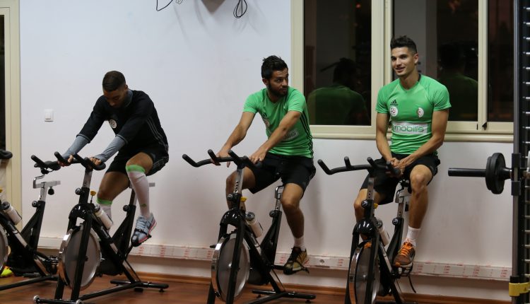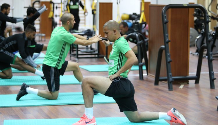 في نفس السياق، بدأ لاعبو الخضر تحضيراتهم بحصة فيديو لمدة نصف ساعة قبل أن يتدربوا في القاعة الرياضية وصولا الى التدريبات الجماعية فوق أرضية الميدان.