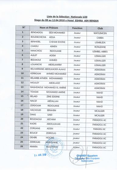 يدخل المنتخب الوطني لأقل من 20 سنة في تربص مُغلق بداية من ال08 أفريل الحالي بمدرسة الفندقة والإطعام بعين البنيان.