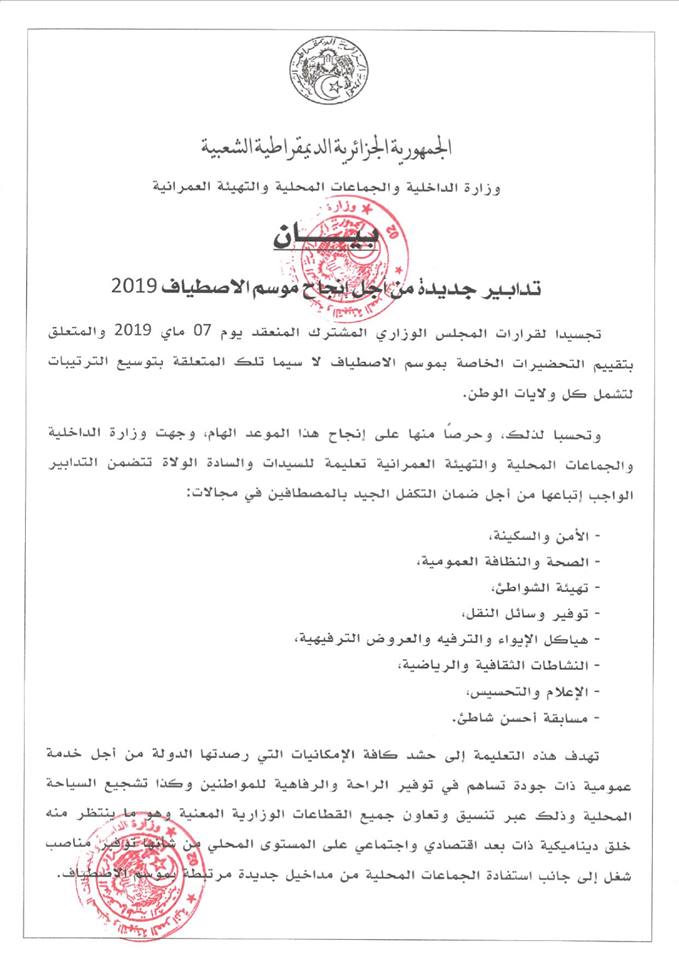 أسدت وزارة الداخلية والجماعات المحلية، تعليمة جديدة للولاة تتضمن التدابير الجديدة الواجب إتباعها من أجل إنجاح موسم الإصطياف.