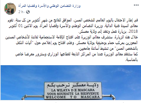 وحسبما جاء في الصفحة الرسمية للوزارة اليوم الأحد ، “أنه يأتي هذا في إطار الإحتفال باليوم العالمي للشخص المسن، الموافق للفاتح من شهر أكتوبر من كل سنة”.