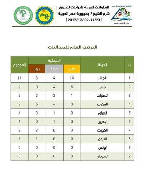 الدراجين الجزائريين تمكنوا من حصد 17 ميدالية موزعة كالآتي: 10 ذهبيات، 4 فضيات، 3 برونزيات.