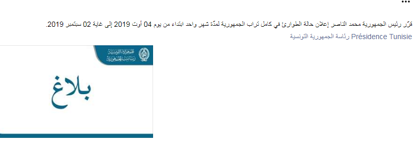 وحسب بيان لرئاسة الجمهورية التونسية، اليوم الجمعة، ستفرض حالة الطوارئ ابتداء من يوم 4 أوت 2019 إلى غاية 2 سبتمبر 2019.