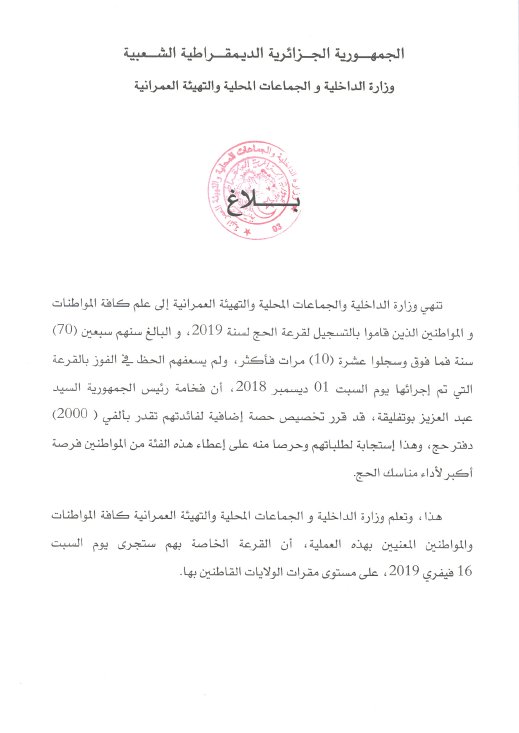 عملية القرعة الخاصة ستجري يوم السبت 16 فيفري 2019 على مستوى مقرات الولايات محل الاقامة.