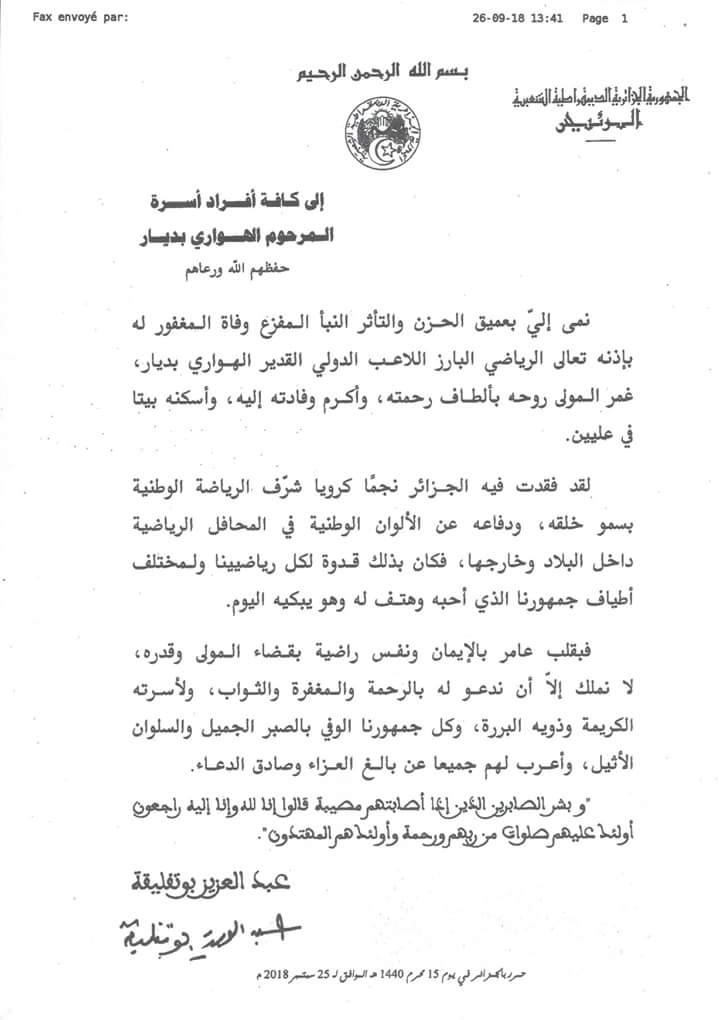قدّم فخامة الرئيس “عبد العزيز بوتفليقة” تعازيه الخالصة لعائلة الراحل “الهواري بديار” المدافع السابق لنادي مولودية وهران الذي وافته المنية بعد صراع طويل مع المرض.