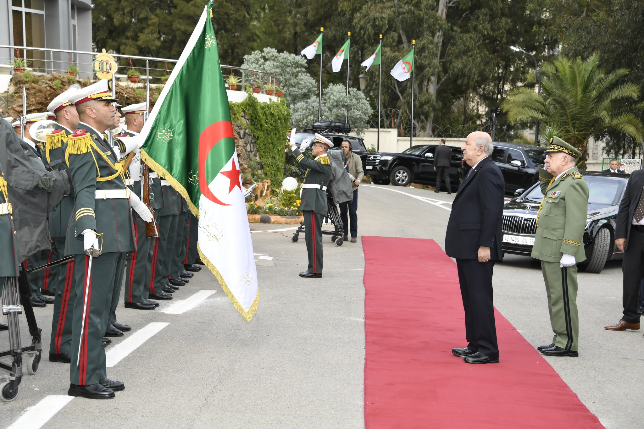في المستهل وبعد مراسم الاستقبال، استمع رئيس الجمهورية للنشيد الوطني وقدمت له تشريفات أدتها تشكيلات من مختلف قوات الجيش الوطني الشعبي، ليحيي بعدها مستقبليه، كل من الأمين العام لوزارة الدفاع الوطني، قائد الحرس الجمهوري، قادة القوات، مدير الديوان لدى وزارة الدفاع الوطني، قائد الدرك الوطني بالنيابة، وقائد الناحية العسكرية الأولى ورئيس دائرة الاستعمال والتحضير لأركان الجيش الوطني الشعبي ورئيس مصلحة الرياضات العسكرية.