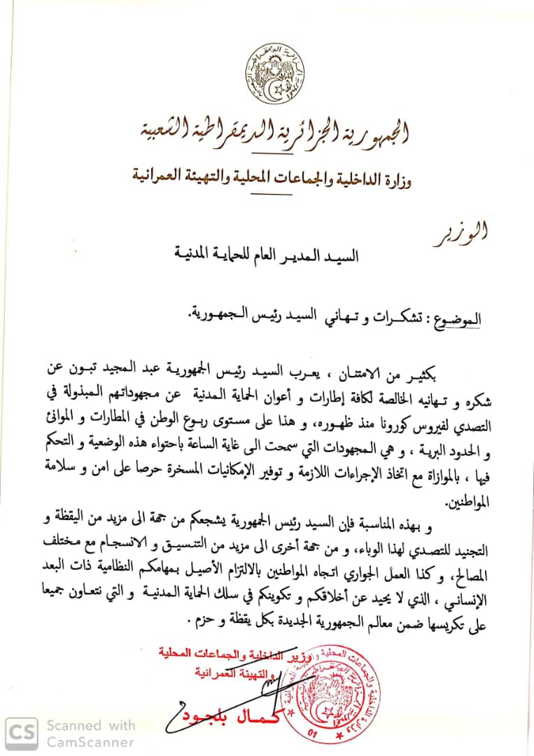 أعرب رئيس الجمهورية عبد المجيد تبون عن شكره وإمتنانه لكافة إطارات وأعوان الحماية المدنية لمجهوداتهم المبذولة للتصدي لفيروس كورونا منذ ظهوره.