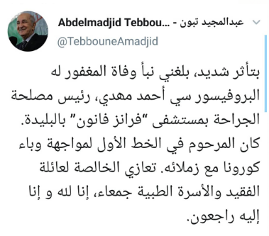 ونشر الرئيس تبون عبر موقعه على التويتر “بتأثر شديد بلغني نبا المغفورله البروفيسور سي أحمد مهدي رئيس مصلحة الجراحة بمستشفى فرانس فانون بالبليدة”.