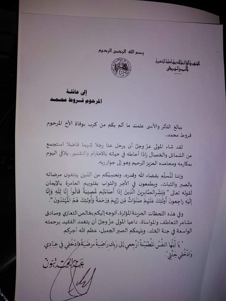 أضاف الرئيس:”وفي هذه اللحظات الحزينة أتوجه إليكم بخالص التعازي وصادق مشاعر التعاطف والمواساة داعيا المولى عزوجل أن يتغمد الفقيد برحمته الواسعة في جنة الخلد، ويلهمكم الصبر الجميل .”