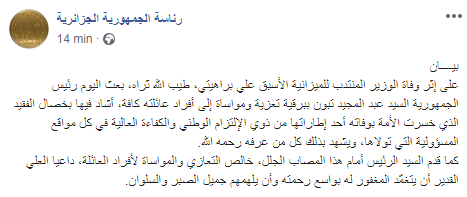 ووفق بيان لرئاسة الجمهورية أنه على إثر وفاة الوزير المنتدب للميزانية الأسبق علي براهيتي، طيب الله ثراه، بعث اليوم رئيس الجمهورية عبد المجيد تبون ببرقية تعزية ومواساة إلى أفراد عائلته كافة.