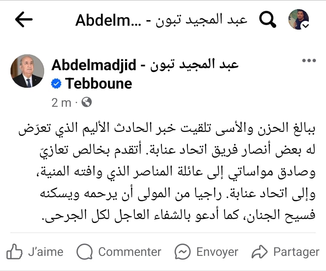 وأضاف الرئيس: “أتقدم بخالص تعازيّ وصادق مواساتي إلى عائلة المناصر الذي وافته المنية. وإلى اتحاد عنابة. راجيا من المولى أن يرحمه ويسكنه فسيح الجنان، كما أدعو بالشفاء العاجل لكل الجرحى.”