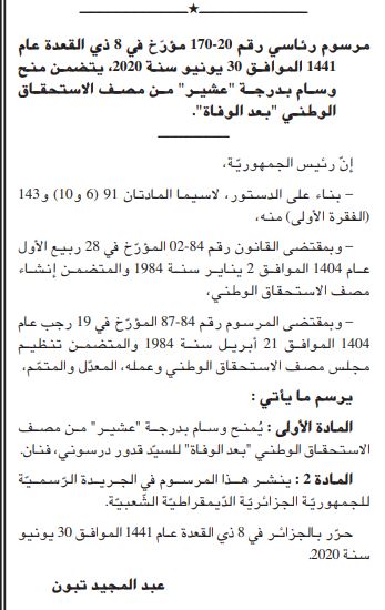 المرسوم وقعة الرئيس عبد المجيد تبون وصدر في العدد الاخير من الجردية الرسمية.