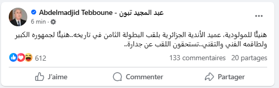 وقال الرئيس تبون “هنيئا للمولودية، عميد الأندية الجزائرية بلقب البطولة الثامن في تاريخه، هنيئا لجمهوره الكبير ولطاقمه الفني والتقني”.