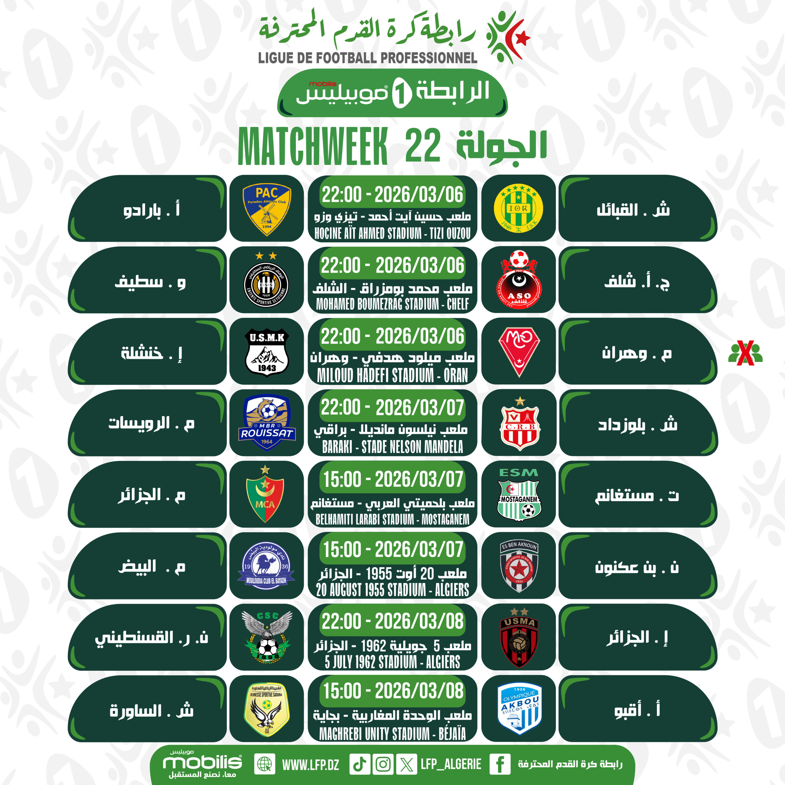 وحسب الموقع الرسمي للرابطة، ستلعب مباريات هذه الجولة الـ22، على مدار ثلاثة أيام 6، 7، و8 فيفري المقبل.