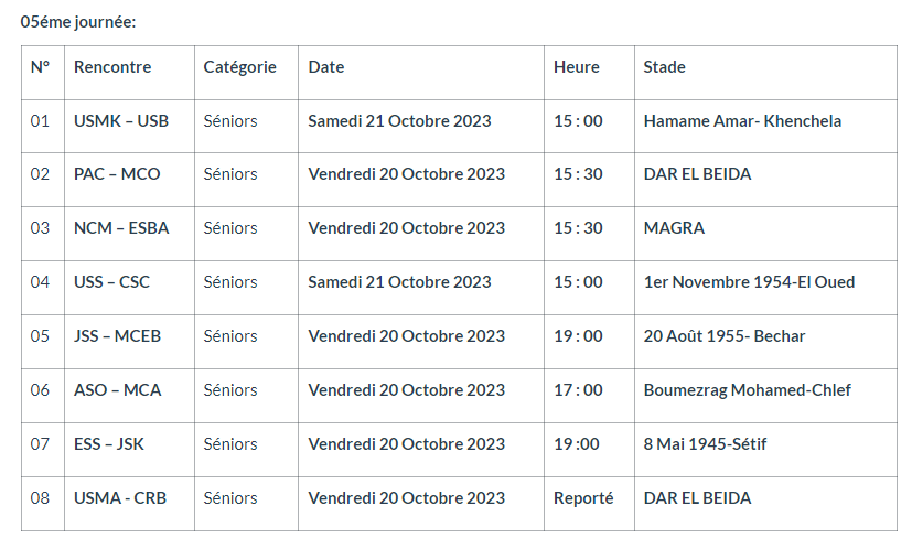 وأوضحت الرابطة المحترفة، عبر موقعها الرسمي، بأن مباريات الجولة الخامسة من البطولة المحترفة، ستلعب يومي الجمعة 20، والسبت 21 أكتوبر الجاري.