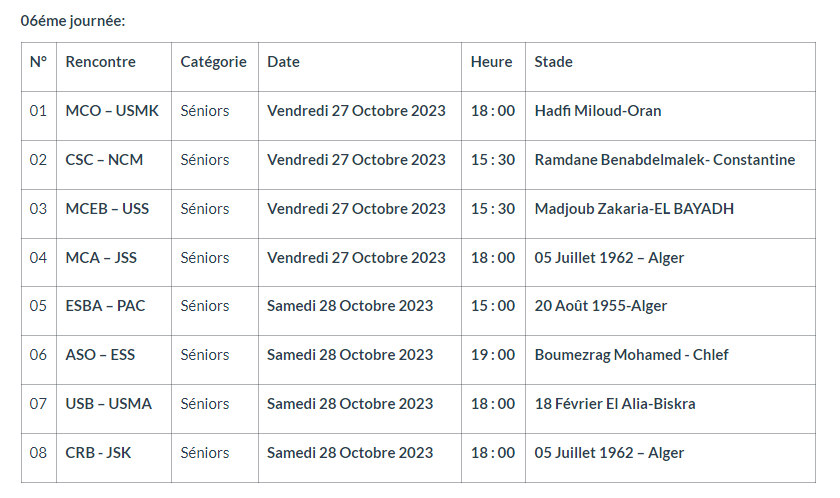 ومن جهة أخرى حددت الرابطة المحترفة تاريخ 27، و28 من ذات الشهر، لخوض مباريات الجولة السادسة من البطولة.
