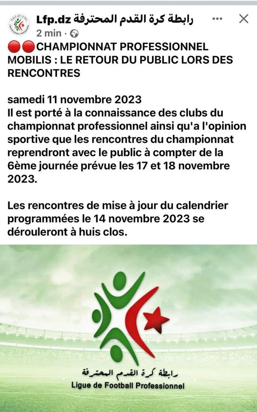 وقالت الرابطة المحترفة أن الجماهير ستعود إلى مدرجات الملاعب بداية من الجولة المقبلة التي ستجري في مختلف الملاعب الجزائرية و بالضبط يومي 17 و 18 نوفمبر.