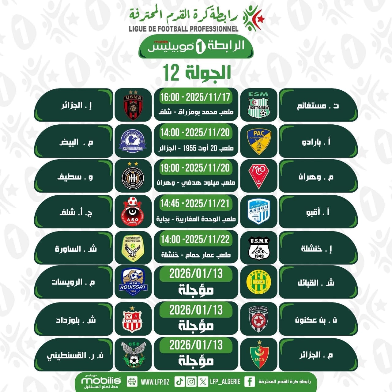 وأوضحت الرابطة المحترفة، عبر صفحتها الرسمية، بأن مباريات هذه الجولة الـ12، ستلعب أيام (17، 20، 21، و22) نوفمبر الجاري.