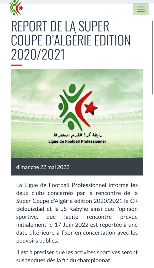 قبل أن يُضيف البيان أن تاريخ المواجهة التي ستجمع شبيبة القبائل المُتوج بكأس الرابطة المُحترفة وشباب بلوزداد الحائز على لقب الرابطة المُحترفة سيتم تحديده بالتشاور مع السلطات العمومية.