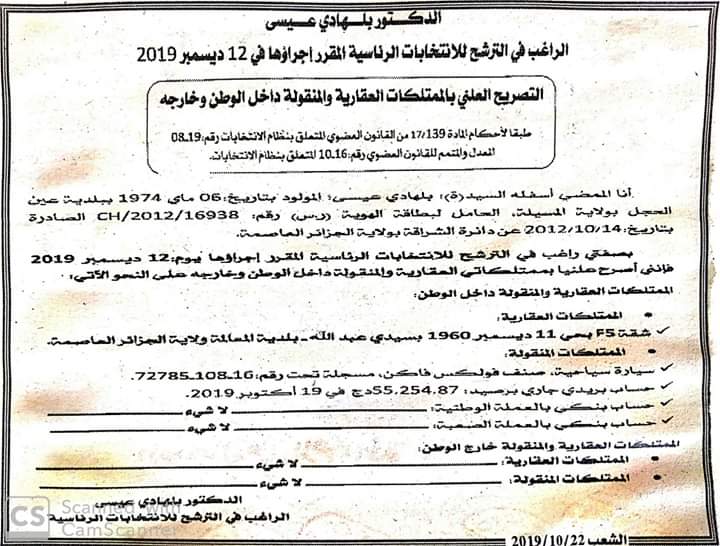 صرّح الراغب في الترشح لرئاسيات 12 ديسمبر، بلهادي عيسى، بممتلكاته، طبقا لأحكام المادة 139 من القانون المتعلق بنظام الانتخاب.