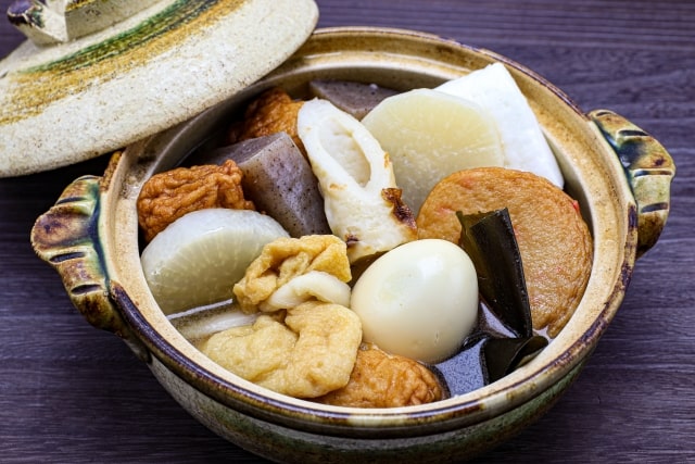يتكون من عدة مكونات مثل البيض المسلوق، والدايكون “فجل أبيض ياباني” ونبتة الكانجو، وكعك السمك.