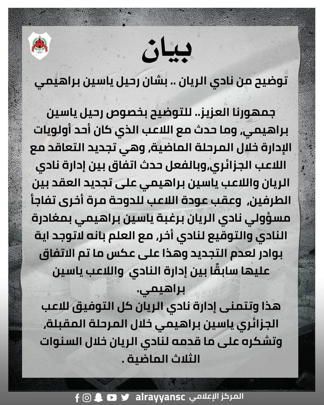 وقال النادي القطري في بيان صادر عنه اليوم الخميس :”للتوضيح بخصوص مغادرة ياسين براهيمي. وما حدث مع اللاعب الذي كان من أولويات الإدارة خلال المرحلة المقبلة للتجديد له”.