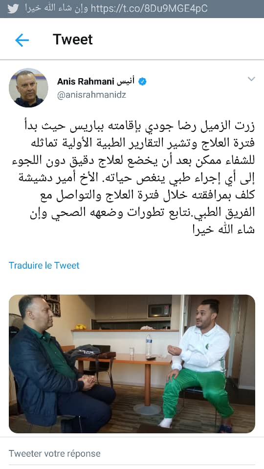 رحماني كتب في تغريدته”زرت الزميل رضا جودي بإقامته بباريس، حيث بدأ فترة العلاج وتشير التقارير الطبية الأولية تماثله للشفاء…”.