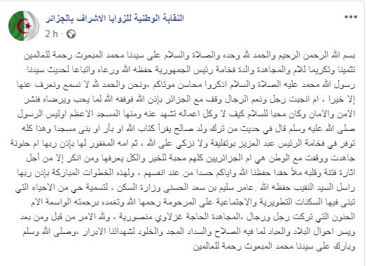 الزوايا الأشراف تطالب بتسمية الأحياء بإسم والدة بوتفليقة