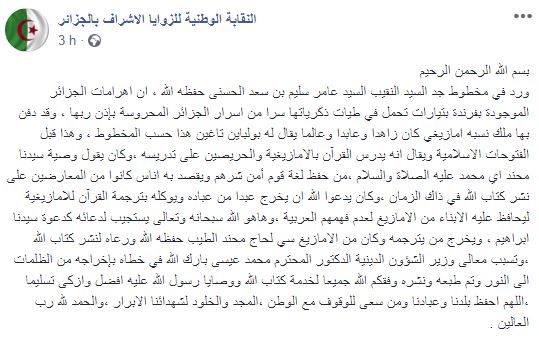 وقالت النقابة في منشور لها على فايسبوك أنه،ورد في مخطوط جد النقيب عامر سليم بن سعد الحسنى ، ان اهرامات الجزائر الموجودة بفرندة في تيارات تحمل في طيات ذكرياتها سرا من اسرار الجزائر المحروسة بإذن ربها.