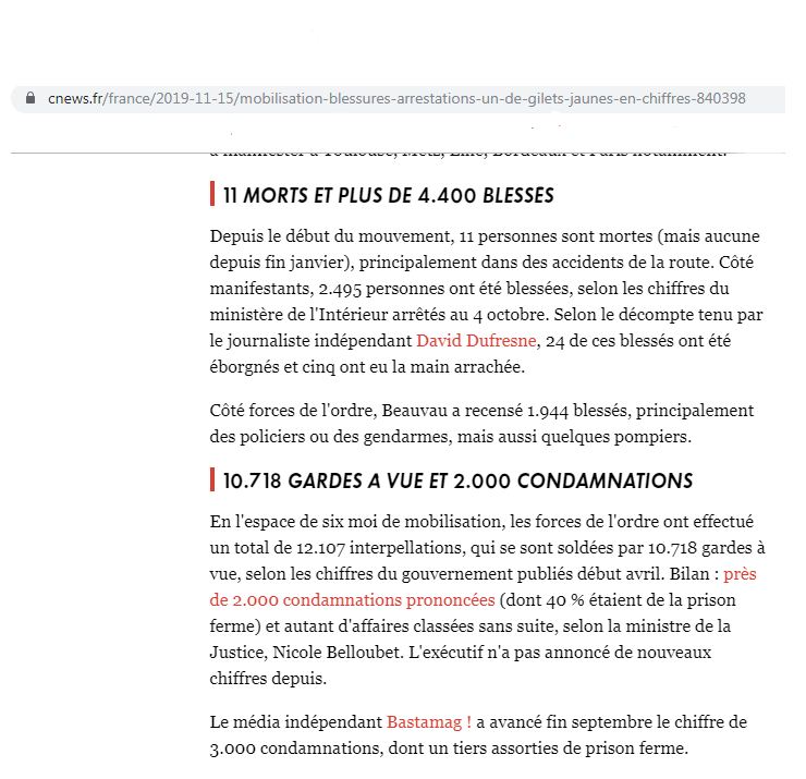 ونقلت الصحافة الفرنسية في ذلك الوقت، عن وزير الداخلية كريستوف كاستانر، قوله إن 1300 شرطي ودركي أصيبوا بجروح خلال مواجهات مع المتظاهرين.