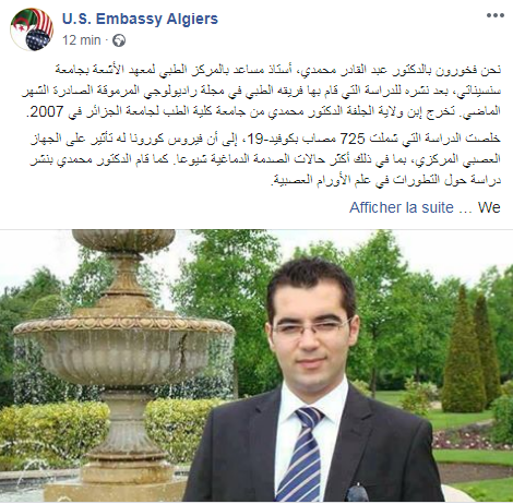 نشرت السفارة الأمريكية بالجزائر تغريدة عبر صفحتها على الفيسبوك تشيد فيها بالدكتور عبد القادر محمدي، أستاذ مساعد بالمركز الطبي لمعهد الأشعة بجامعة سنسيناتي.