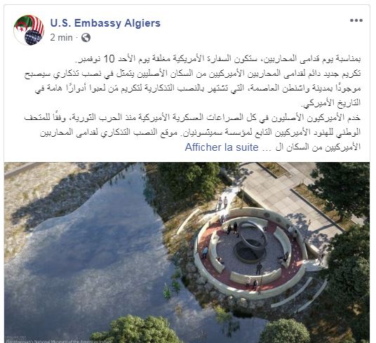 ونشرت السفارة في صفحتها الرسمية على فايسبوك، انه تكريم جديد دائم لقدامى المحاربين الأميركيين من السكان الأصليين يتمثل في نصب تذكاري سيصبح موجودًا بمدينة واشنطن العاصمة، التي تشتهر بالنصب التذكارية لتكريم مَن لعبوا أدوارًا هامة في التاريخ الأميركي.