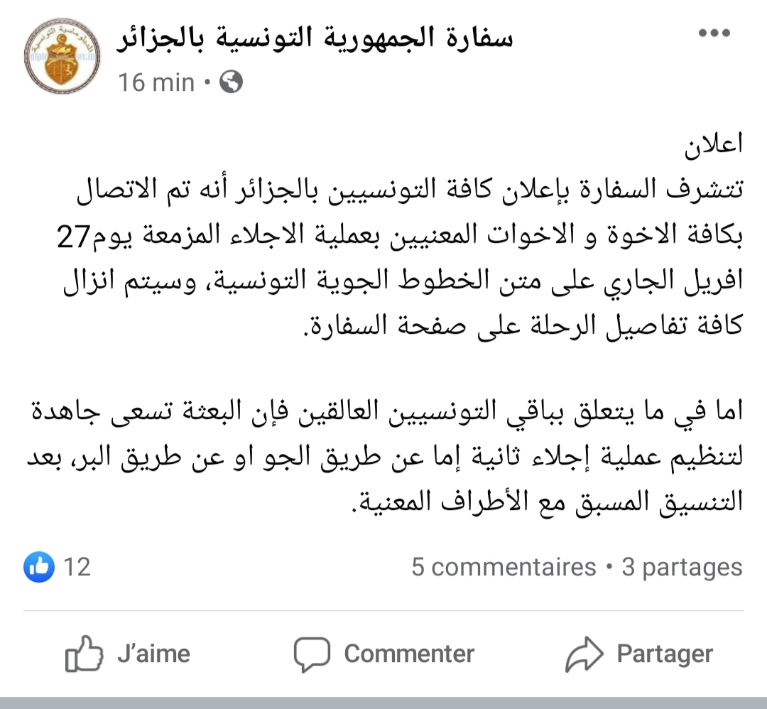 أعلنت السفارة التونسية بالجزائر، أنه تم الإتصال بكافة المعنيين بعملية الإجلاء المزمعة يوم 27 أفريل الجاري على متن الخطوط الجوية التونسية.