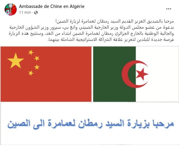 وللإشرة، أفاد بيان للخارجية الصينية، إنه بناء على دعوة من مستشار الدولة ووزير الخارجية وانغ يي، سيحل وزير الشؤون الخارجية والجالية الوطنية بالخارج رمطان لعمامرة ببكين”.
