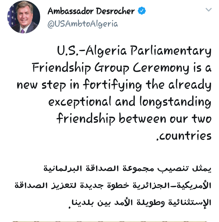 وغرد على حسابه الشخصي “تويتر” “يمثل تنصيب مجموعة الصداقة البرلمانية الجزائريةـ الأمريكية خطوة لتعزيز الضداقة الإستثنائية وطويلة الأمد بين بلدينا”.