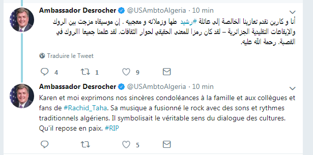 قدم اليوم الخميس السفير الأمريكي بالجزائرتعازيه الخالصة لعائلة الفنان رشيد طه والذي وافته المنية أمس بفرنسا عن عمر ناهز 59 سنة.