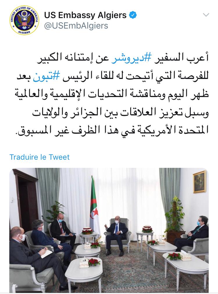 عقب اللقاء الذي جمع الرئيس تبون والسفير الأمريكي أعرب جون ديروشر عن إمتنانه للفرصة التي أتيحت لها للقاء الرئيس تبون.
