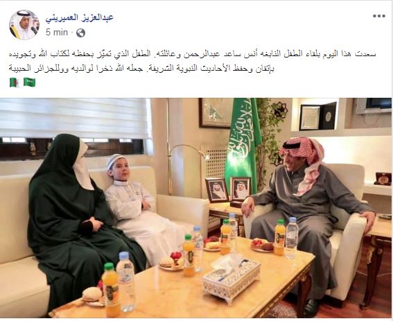 وكتب العميريني  على صفحته الرسمية في فايسبوك: سعدت هذا اليوم بلقاء الطفل النابغه أنس ساعد عبدالرحمن وعائلته. الطفل الذي تميّز بحفظه لكتاب الله وتجويده بإتقان وحفظ الأحاديث النبوية الشريفة.. جعله الله ذخرا لوالديه ووللجزائر الحبيبة.