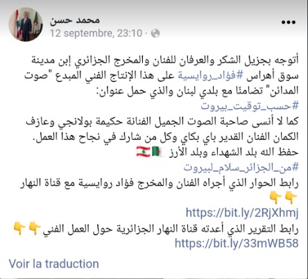 نشر سفير دولة لبنان بالجزائر محمد حسن على حسابه الخاص بمواقع التواصل الإجتماعي، تعليقا بخصوص تضامن فنانين جزائريين مع محنة بيروت الأخيرة.