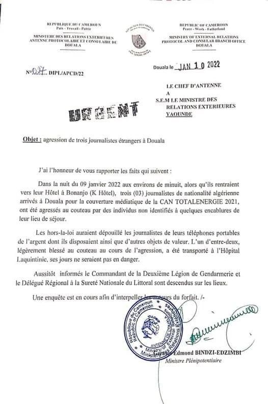 للإشارة فقد عرفت مدينة دوالا الكاميرونية سهرة أمس الأحد حادثة مؤسفة كان بطلها بعض المُجرمين الكاميرونيين. حيث اعتدوا على ثلاث إعلاميين جزائريين بالأسلحة البيضاء. و أُصيب إثنين منهم بجروح.