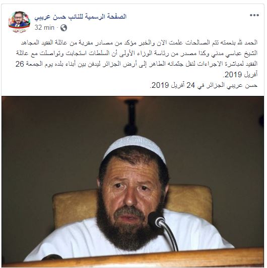 ونشر عريبي على صفحته الرسمية على فايسبوك:”الحمد لله بنعمته تتم الصالحات علمت الآن والخبر مؤكد من مصادر مقرّبة من عائلة الفقيد المجاهد الشيخ عباسي مدني وكذا مصدر من رئاسة الوزاء الأولى أن السلطات استجابت وتواصلت مع عائلة الفقيد لمباشرة الإجراءات لنقل جثمانه الطاهر إلى أرض الجزائر ليدفن بين أبناء بلده يوم الجمعة 26 آفريل 2019.”