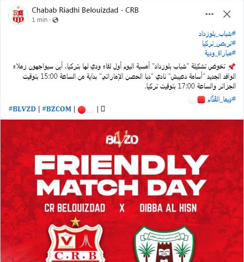 وكشفت إدارة الشباب بأن أشبال الفرنسي مارتيتز. سيلاقون مساء اليوم بداية من الساعة 15:00 بتوقيت الجزائر (17:00 بتوقيت تركيا) نادي دبا الحصن الإماراتي.