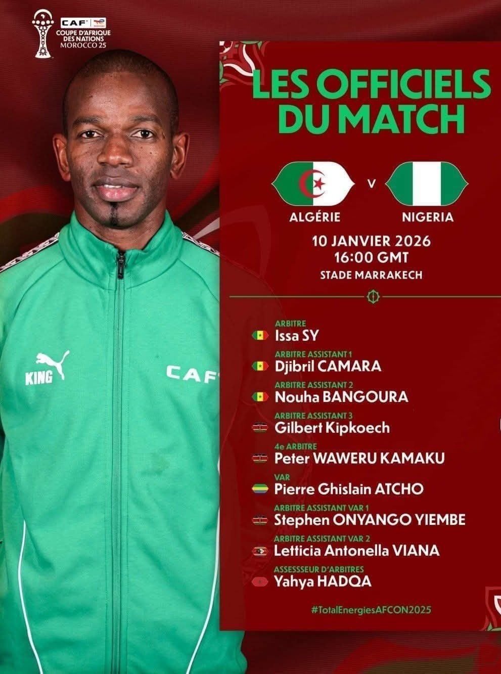 عيّن الاتحاد الإفريقي لكرة القدم، الحكم السينغالي عيسى ساي، لإدارة مباراة ربع نهائي كأس أمم إفريقيا، والتي ستجمع المنتخب الوطني، بمنتخب نيجيريا.