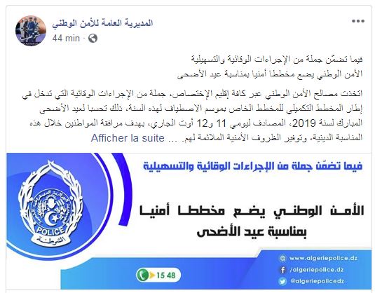 كما وضعت المديرية العامة للأمن الوطني، برنامجا لتسهيل حركة المرور، خاصة عبر الشوارع والطرقات التي تشهد كثافة مرورية تفاديا لحوادث السيّر وعرقلة حركة المرور، نظرا لما تعرفه أيام العيد الأضحى من تنقلات كثيرة للمواطنين من أجل أداء شعيرة الذبح والقيام بالزيارات العائلية، من خلال تسخير كافة الإمكانيات البشرية والمادية، التي تُمكّن جميع المواطنين من قضاء العيد في ظروف أمنية ملائمة.