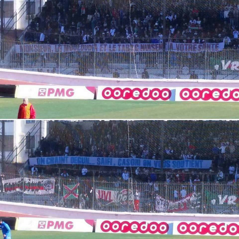 ورفع الشناوة رايات في مدرجات ملعب 20 أوت اليوم بمناسبة مواجهة النصرية، كتب عليها: “سيدي.. المولودية والتدخين يضران بصحتك”.