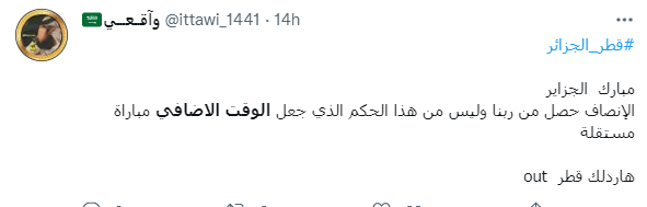 وحتى اللاعبون والصحفيون والفنانون عبر العالم العربي، تفاعلوا مع ترند “الوقت الإضافي” . وعبروا عن ما أسموه بـ “مهزلة تحكيمية”، فخورين بالفوز المستحق للخضر أمام العنابي القطري.