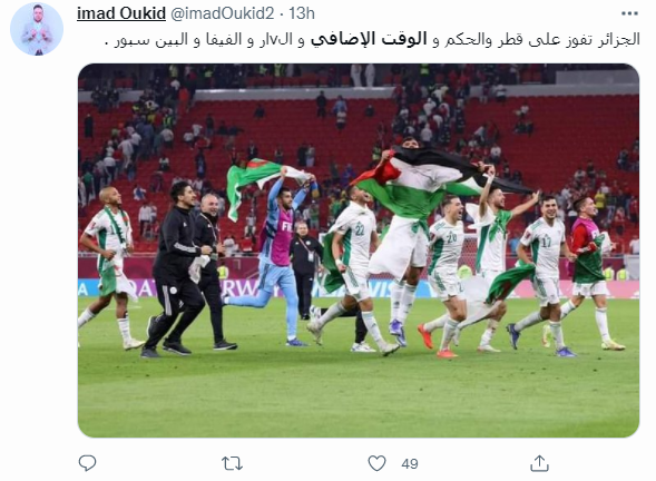 في حين راح الجزائريون، يحتفلون بالفوز المحقق للخضر على البلد المنظم صاحب الأرض والجمهور. بالرغم من إضافة الحكم البولندي ما أسماء الفايسبوكيون بـ “الشوط الثالث”، على طريقتهم الخاصة بصور مضحكة وعبارات ساخرة.
